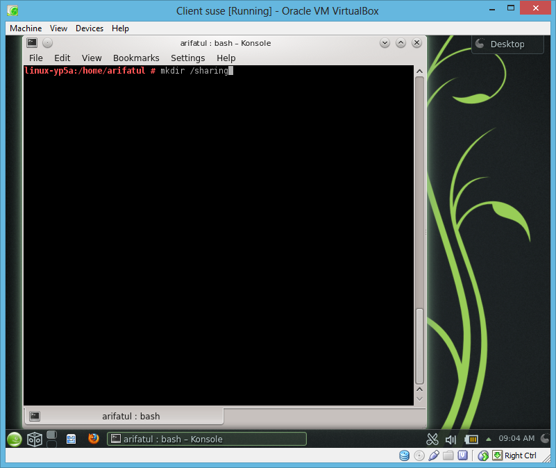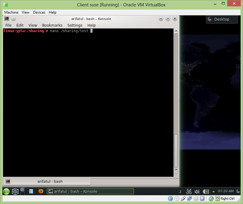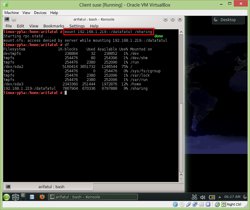 dan mount dari client ke server dengan cara “mount (ip server) /(folder server) /(folder client)