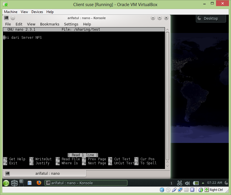 13. Lalu coba membuat file dan langsung edit filenya di server. Sintaksnya “nano /(dataserver)/(nama file)”.