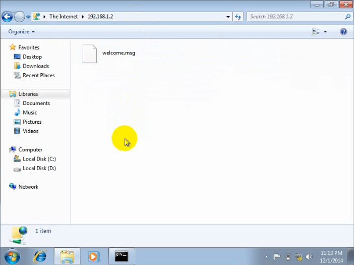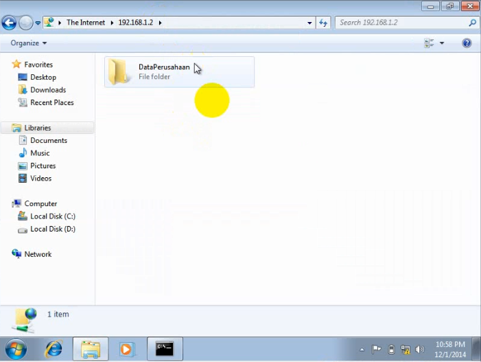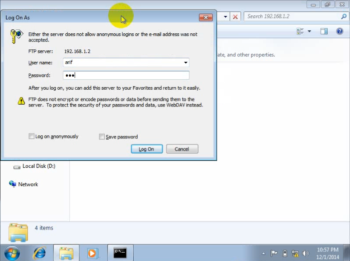 7. kemudian cek FTP di client dengan windows explorer. sebelumnya atur IP client nya dulu dan gatewaynya harus IP server. login dengan user yang telah dibuat.