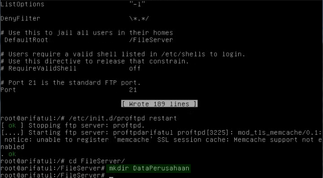 14. Kemudian di restart dengan menggunakan perintah /etc/init.d/proftpd restart. kemudian coba di client login ke FTP. Kemudian buat folder "DataPerusahaan" didalam folder "FileServer"