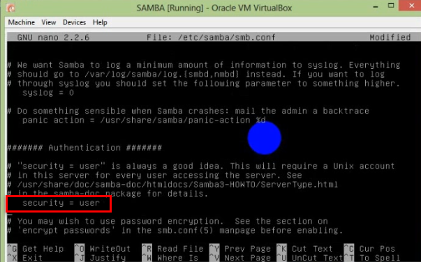 5. kemudian edit file “nano /etc/samba/smb.conf”. cari tulisan "security" dan hapus tanda pagar yang di depannya.