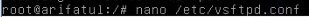 15. Kemudian atur user yang bisa login ke FTP. Jadi tidak semua user dapat login ke FTP. Masukkan sintaks ‘nano /etc/vsftpd.conf’.