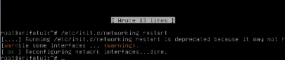 3. Lalu restart network dengan sintaks ‘/etc/init.d/networking restart’.
