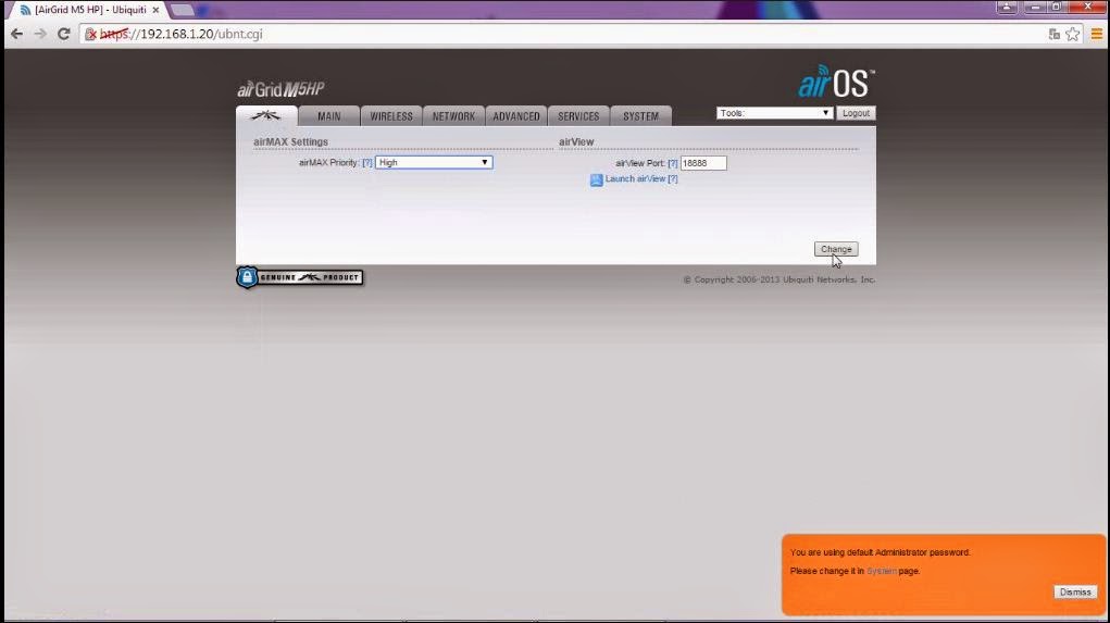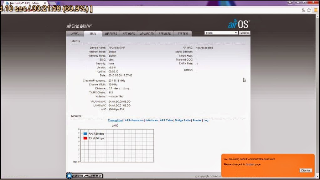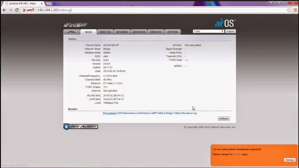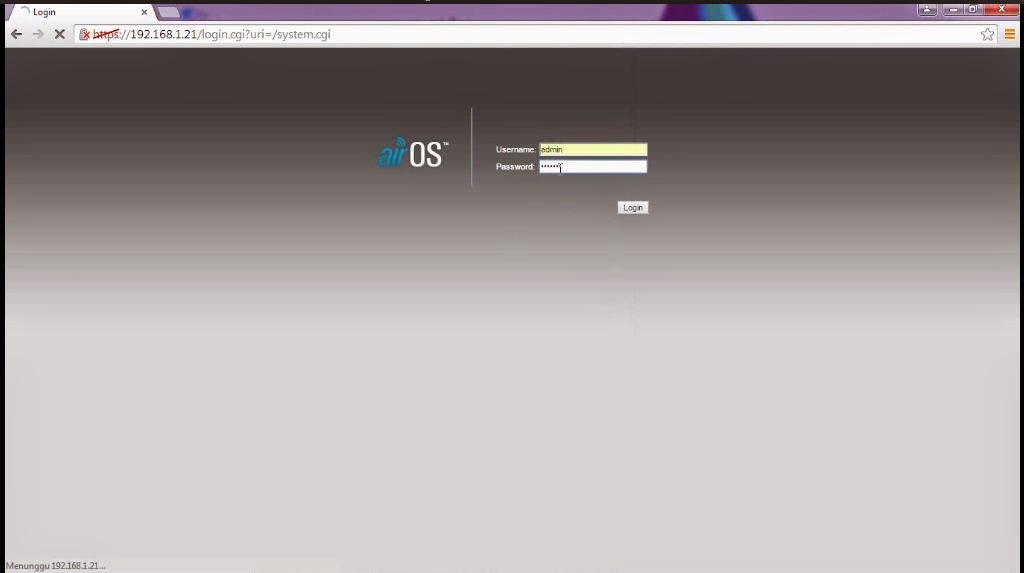 11. Seperti tadi, buka browser dan masukkan 192.168.1.20. mendaftar dengan username "ubnt" dan seterusnya.