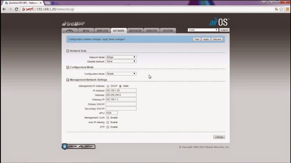 15. Kemudian masuk ke tab Network, disini Ubah IP Radio Wireless-nya. Jangan disamakan dengan IP Access Point. Jika sudah klik Change.