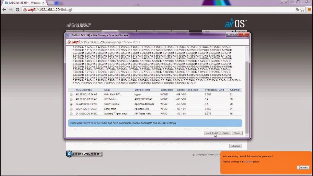 13. Kemudian akan memindai secara Otomatis Wireless yang ada disekitar kita. Pilih Access Point yang kita buat tadi kemudian Lock to AP.