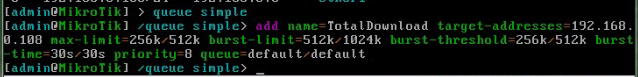 add name=TotalDownload Target-Addresses=(IP MikroTik) max-limit=256k/512k burst-limit=512k/1024k burst-threshold=256k/512k burst-time=30s/30s priority=8 queue-default/default
