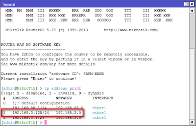 3. coba lihat ip dengan perintah "ip address print"