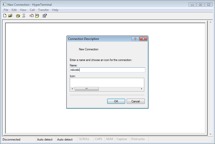 1. Buka Hyper Terminal, kemudian kita diminta memasukkan nama. ketikkan nama apapun.