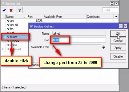 2. double klik pada service telnet, kemudian ganti port nya dari 23 menjadi 8080.