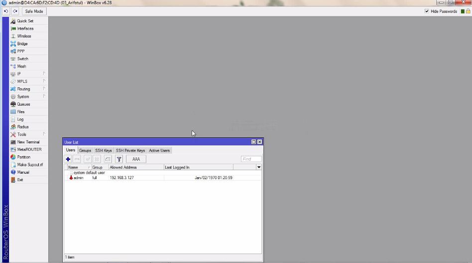 6. back to user list, double click on user "admin" then give IP addres on user "admin". this serves to allow specific IP remotely mikrotik.