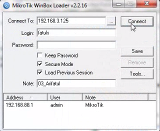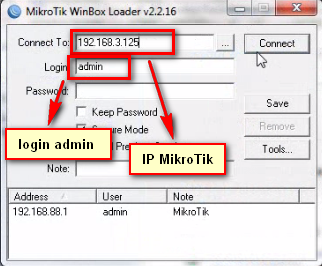 1. Kembali ke IP service list, double klik pada winbox kemudian berikan IP untuk akses winbox.