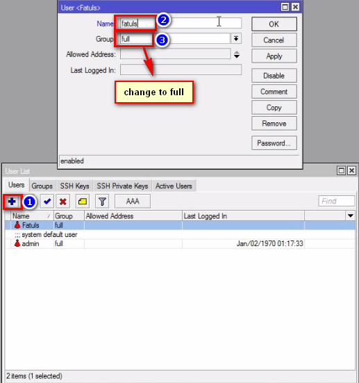 2. kemudian klik simbol (+) untuk menambah user baru. Ganti grup user menjadi FULL.