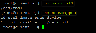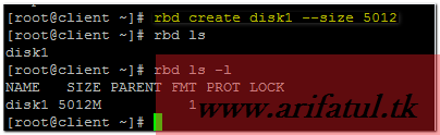 1. Buatlah disk baru menggunakan rbdrbd create disk1 --size 5012
