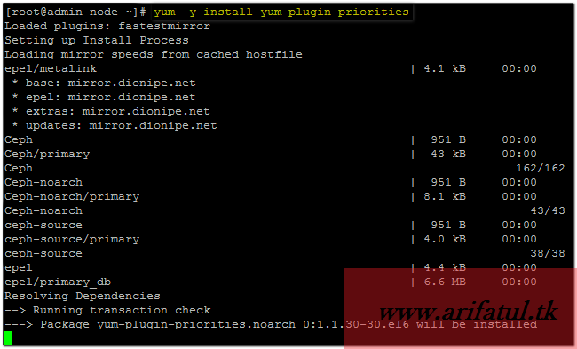 1. tambahkan priority=1 sebelum installasi Ceph dengan carased -i -e "s/enabled=1/enabled=1\npriority=1/g" /etc/yum.repos.d/ceph.repodan install plugin priorities dengan cara