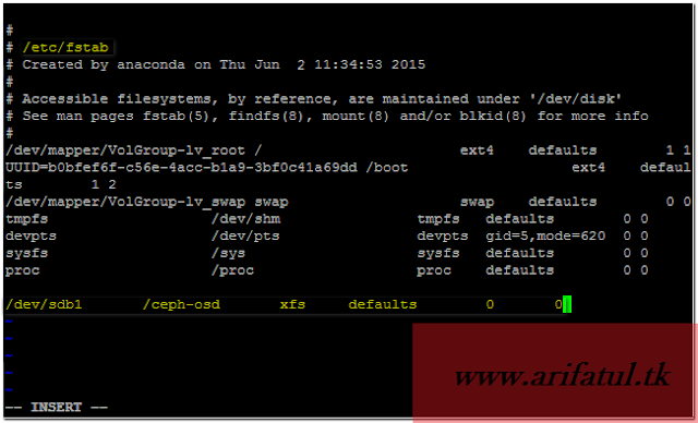 3. Edit file /etc/fstab dan tambahkan perintah mount dibaris paling bawah yang berfungsi memounting otomatis partisi tersebut saat booting.