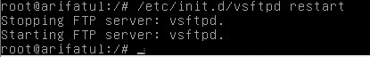 10. Kemudian restart VSFTPD dengan sintaks ‘/etc/init.d/vsftpd restart’.