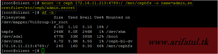ceph-fuse -m 172.16.11.213:6789 mycephfs/